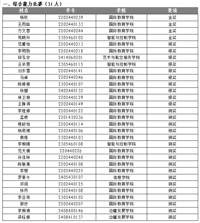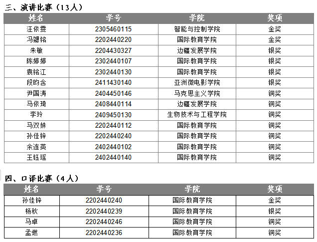根据云南省教育厅办公室关于举办2024“外研社· 国才杯”“理解当代中国”全国大学生外语能力大赛云南省复赛的通知要求,经学校同意,国际教育学院于2024年9月21日至2024年10月16日成功举办了2024“国才杯”英语综合能力、笔译、演讲、口译四项赛事的校赛初赛、决赛。通过比赛,杨秋等84名同学获奖。以下为各项比赛获奖名单: